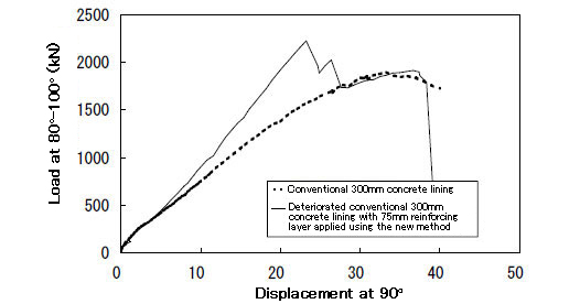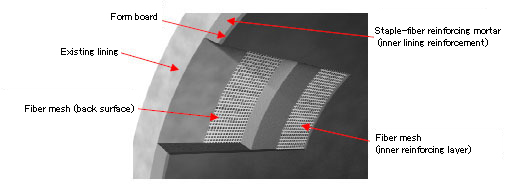 - The reinforcing layer can be made thin due to the use of a fiber reinforcing mortar of exceptional strength (compressive strength: 40-60 MPa). Results of research conducted in collaboration with the Public Works Research Institute showed that a 75mm reinforcing layer had the same load-bearing performance as existing 300mm liners.