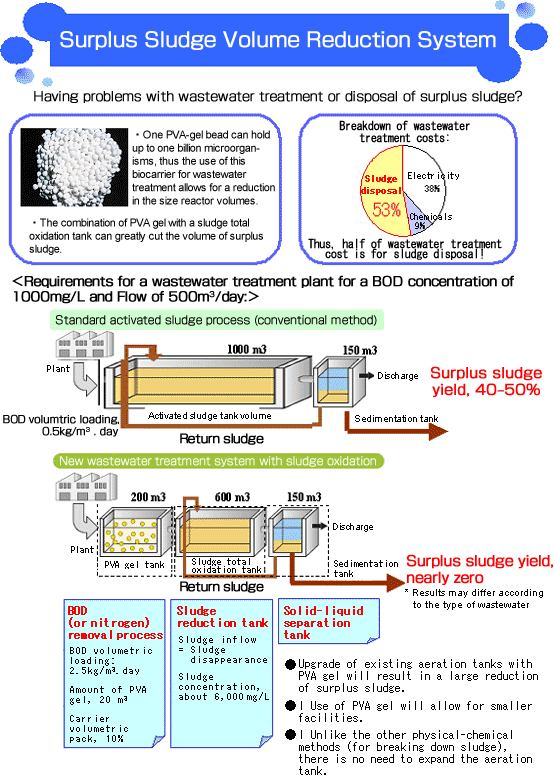 The system developed by Kuraray is composed of a biological treatment unit, a sludge elimination tank and a sedimentation tank. In the biological treatment unit, a biocarrier for immobilization of effective microorganisms composed of PVA gel (Kuraray Co., Ldt.) is utilized, which allows for a reduction of the tank size to approximately one fifth of those in current use. The sludge elimination tank enhances the endogenous decay of the sludge by controlling the amount of organic matter in the porcess, which in effect starves the microorganisms, thus reducing their numbers. Through many trail tests it has been demonstrated that removal of surplus sludge from the tank is rarely necessary. In addition, capital investment and running costs are cut, reflecting the fact that this system does not require ozone or any other special chemicals to reduce the sludge volume.