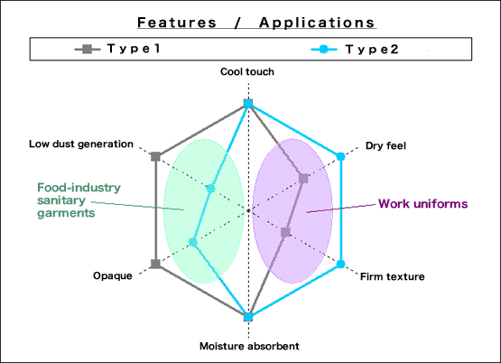 A material for uniforms that provides a cool and refreshing touch by utilizing the cool feel and the moisture adsorption and desorption properties of EVOH fibers. The material contributes to comfort in the industrial working environment by enabling the creation of more refreshing sanitary garments for the food industry and work uniforms. Through the addition of this new product, we expect to be able to meet a wider range of needs.