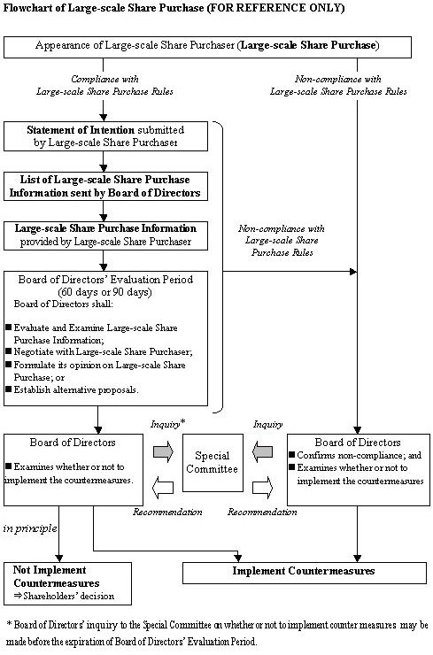 The Plan sets out the procedures for the Large-scale Share Purchase 1) (the "Large-scale Share Purchase Rules"), as the effort which prevents a person who is deemed to be inappropriate in light of the above-mentioned basic policy from controlling the Company's financial and business policy decisions, which demand Large-scale Share Purchaser to provide necessary information for the shareholders' determination and to secure adequate period of time required for the shareholders to evaluate and examine the substance of the proposed Large-scale Share Purchase, for the purpose of enhancing the Company's corporate value and the shareholders' common interests.