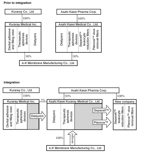 The Sepacell™ leukocyte reduction filter and Planova™ virus removal filter businesses of AM will be transferred to a newly established company. AM, retaining its dialyzer and therapeutic apheresis device businesses, will be renamed Asahi Kasei Kuraray Medical Co., Ltd. The dialyzer businesses of KM will be transferred to Asahi Kasei Kuraray Medical. KM will retain its dental adhesive and filling resin business and its therapeutic apheresis device business. A-K Membrane Manufacturing Co., Ltd., joint venture of AM and KM for the production of Eval® hollow-fiber membrane for medical devices, will become a wholly owned subsidiary of Asahi Kasei Kuraray Medical, and then merged with that company.