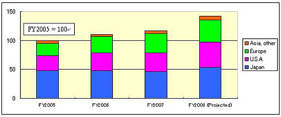 Kuraray Medical is now leveraging its high level of expertise, honed in the demanding Japanese market, to drive its global business expansion. The company has established a comprehensive marketing network with local Kuraray subsidiaries in the US (Kuraray America, Inc.) and Europe (KEG) and continues to expand its business in those markets while further building its presence in China and other Asian markets. During this three-year period (2006-2008), Kuraray Medical is on track to raise the share of overseas sales in its dental materials business from 52% to 63% (see table and graph).