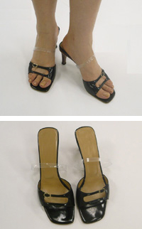 The mule-band combines Kuraray Fastening's MAGIC TAPE with Kuraray's SEPTON styrene elastomer resin. In use, a clear strap composed of SEPTON wraps around the instep of the foot, firmly held in place by a MAGIC TAPE section that is secured underneath the shoe.