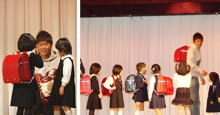Thanks to Utsumi's achieving 154 strikeouts during the 2008 season, the same number of school bags was given to new first year elementary school students who live in orphanages located mainly in Tokyo, the home of the Giants, and Kawasaki City. Kuraray, in coordination with school bag manufacturers, is assisting in the distribution of school bags and other related activities.