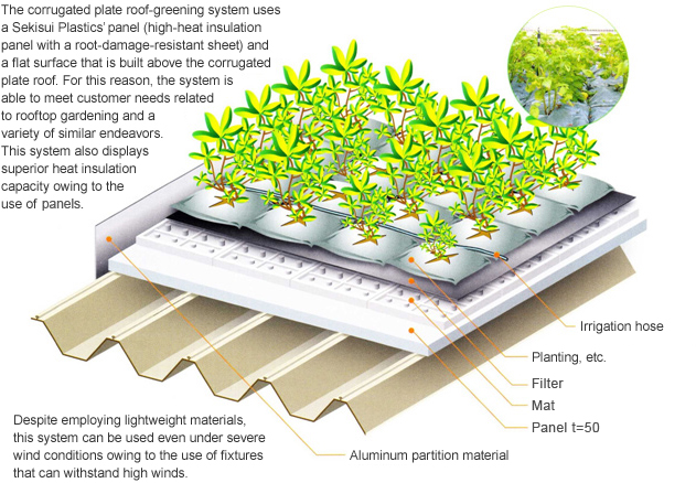 The lightweight, thin-layer rooftop gardening and corrugated plate roof-greening system uses high-heat insulation panels with root-damage-resistant sheets (manufactured by Sekisui Plastics Co., Ltd.) and is constructed with a flat surface that is placed over corrugated plate roofs. The mat, filter and soil pouch construction is placed above this to allow for plant growth.
