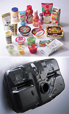 In 1972, Kuraray became the first company in the world to commercialize the EVOH-type resin, EVAL. Featuring the highest level of gas impermeability in plastic, Kuraray boasts the largest global share of this material at 65%. EVAL is widely popular for use in food packaging, owing to its ability to shut out oxygen, thereby protecting contents of a container against deterioration. EVAL is also used in automotive plastic fuel tanks to prevent the leakage of harmful hydrocarbons given off by gasoline. This feature helps to reduce the weight of vehicles. In addition to these wide ranging applications, EVAL is used in vacuum insulation layers for large-sized refrigerators.