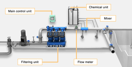 - Eliminates most ballast water plankton, both small (10 to 50μm) and large (50μm and up) using a proprietary high-precision filter. Remaining plankton and bacteria are sterilized with low concentrations of active substances.