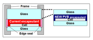 Left: Structure using existing encapsulants, Right: Structure using the new PVB encapsulant