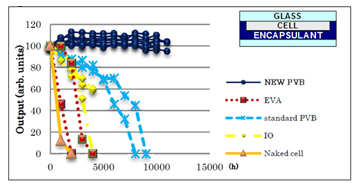 Damp heat test of a-Si thin film PV modules according to IEC61646 (tested in joint research with Research Center for Photovoltaic Technologies, AIST by the “Consortium Study on Fabrication and Characterization of Solar Cell Modules with Long Life and High Reliability”). The module using this new PVB film had no degradation after 10,000 hours.