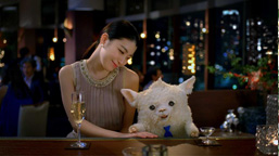 The commercial was shot in early December. First to strut his stuff in the studio was Kuraray-Chan the alpaca. This commercial featured the seventh alpaca to play Kuraray-Chan, a male named Kaikai. Kaikai has a very mild disposition, and filming of his scenes, in which he had to walk continuously, went smoothly. Kaikai's cute trot brought smiles to the faces of the production staff, in keeping the origin of his name, the phrase "Hito wo yukai ni, chikyu wo yukai ni shitai," meaning "desire to bring joy to people and the Earth." The performance of Riko Narumi and Kuraray-Maru together was not to be missed, either. The two are seen on a date in a stylish bar, the refined-looking Riko and the comical Kuraray-Maru proving a captivating combination. Kuraray-Maru was controlled by specialist staff, with subtle movements that gave the strong impression that the puppet was a real animal. Between takes, Riko Narumi too was greatly entertained by the movements of Kuraray-Maru. The atmosphere on set was relaxed and friendly, and shooting concluded successfully.