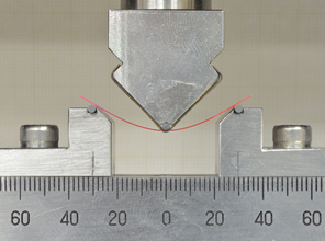 Since the new product has higher flexural strength and fracture toughness than conventional zirconia, it exhibits such characteristics as the ability to withstand being deformed to a high degree without fracturing. The photo at right shows a side view of a 0.2 mm thickness by 4.0 mm width plate of the new product being subjected to a three-point flexural strength test. The test plate was dyed red to make it more visible.