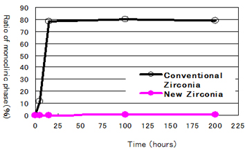 Although the yttria partially stabilized zirconia currently in wide use is very strong, it possesses the fragility which is characteristic of ceramics. Zirconia is also known to gradually weaken over time as the crystal structure changes from a tetragonal phase to a monoclinic one when exposed to hydrothermal condition*1.
