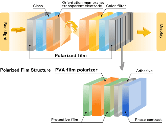 Polarized film absorbs the light in a molecular axial direction, and conducts it only in a perpendicular direction in a shutter-like function. It is an indispensable component of LCD. The major material of polarized film is optical-use poval film. It is produced by dyeing polyvinyl alcohol in iodine and stretching it.