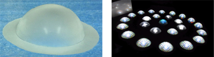 Illustrations of diffusion patterns possible with single LED point sources.  Film with micropatterned cylinders (left) and tetrahedrons (right)