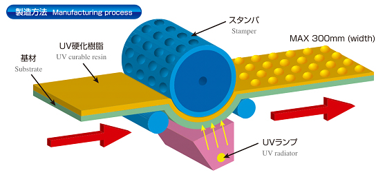 - Roller-type stampers are used to allow the continuous manufacture of light-shaping film, increasing productivity.