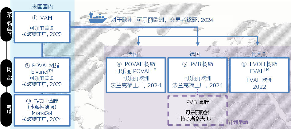 在美国,我们取得了自VAM到经过聚乙烯醇(PVA)树脂到水溶性薄膜所有产品的认证。而在欧洲,我们取得了可乐丽欧洲的交易者认证,同时本公司的醋酸乙烯酯公司拥有的3种树脂,即PVA树脂、PVB树脂及EVOH树脂产品的主要工厂也都获取了认证。