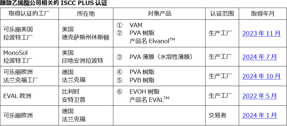 株式会社可乐丽(总部:东京都千代田区、社长:川原 仁)截至2024年10月,已经取得美国及欧洲4家集团内企业及4个生产基地醋酸乙烯酯系列6种产品的可持续产品国际认证制度之一的ISCC PLUS认证※1,同时建立了起始美国拉波特(La Porte)工厂生产的醋酸乙烯(Vinyl Acetate Monomer, VAM)的欧美之间获认证的供应链。