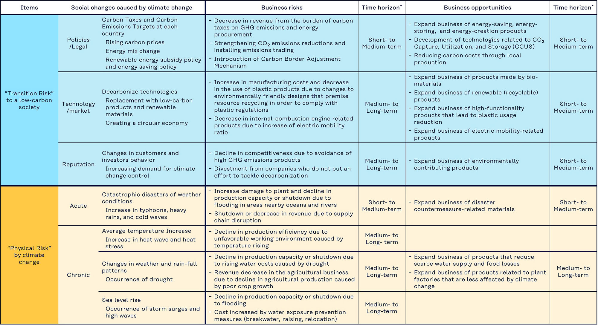 Kuraray Group has selected the risks and opportunities for events assuming in the transition to a low-carbon society and for physical events caused by climate change as shown in Table 1 below.