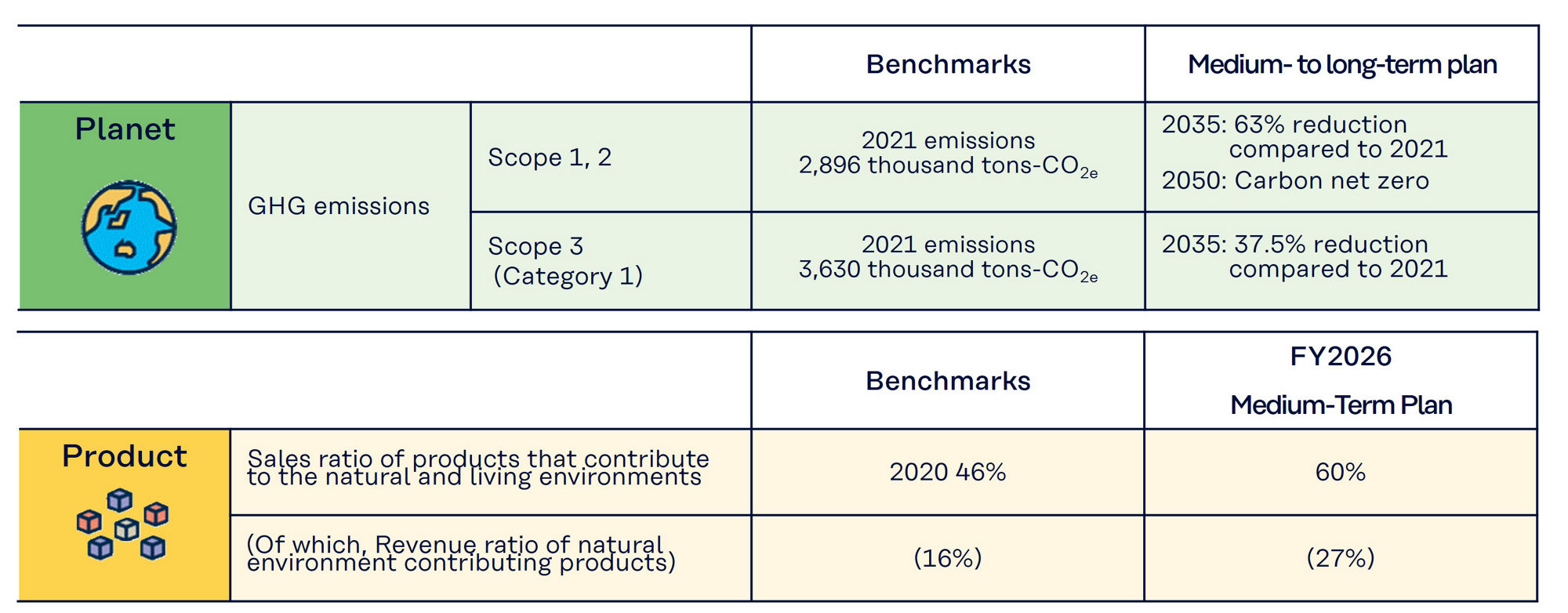 In the Sustainability Medium-Term Plan, Kuraray Group has set targets for reducing GHG emissions related to climate change and increasing sales of products that contribute to the natural and living environment, as shown in Table 3. Kuraray Group has set a goal of achieving net zero carbon emissions by 2050 and has set targets to reduce Scope 1 and 2 emissions by 63% and Scope 3 (Category 1) emissions by 37.5% by 2035 compared to 2021 levels.