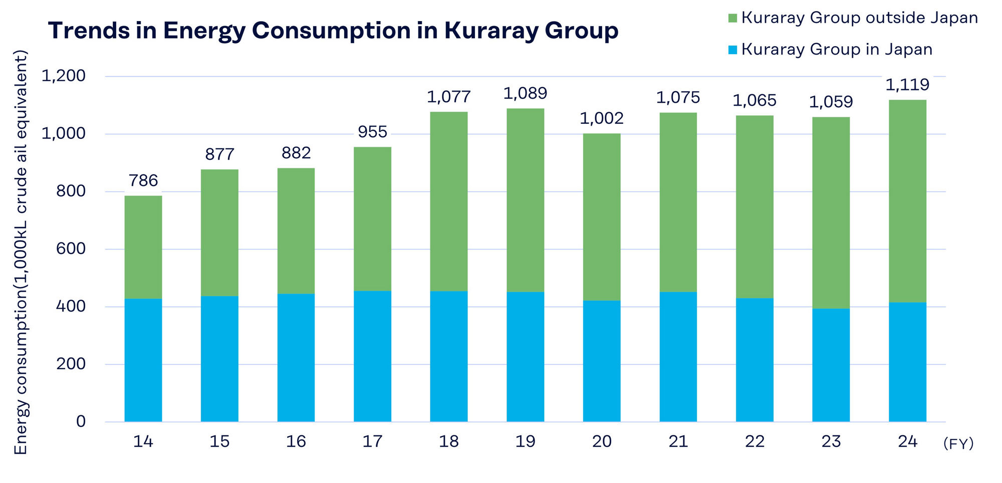 The sales intensity of energy consumption in the Kuraray Group, which was set as the target in the Sustainability Medium-Term Plan for Planet, reduced by 13.8% (improvement) in 2024 compared to 2019, far exceeding our target of the "Reduction (improvement) of 5% or more in 2026". Going forward, we will continue to work on further improvement of sales intensity through energy-saving activities that will contribute to the reduction of GHG emissions.