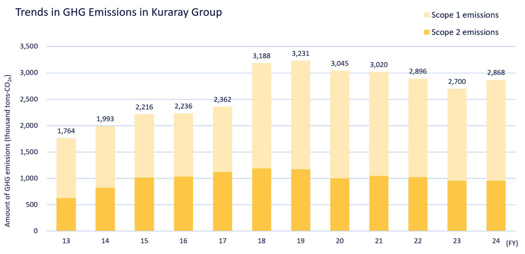 The results for Scope 1, 2 emissions in 2024 were 2,868 thousand tons-CO2e. Although Scope 1, 2 GHG emissions in 2024 were 132 thousand tons-CO2e higher than in 2023 due to the full-scale operation of new Thai plant for isoprene products, along with the start-up of new activated carbon facilities in the United States, we remained below our emission targets (3,020 thousand tons-CO2e in 2021 benchmark level) owing to measures to save energy and boost production efficiency. As in the previous year, we took measures to promote the greening of electricity, including the purchase at overseas Group companies of Unbundled Energy Attribute Certificates (renewable energy certificates).