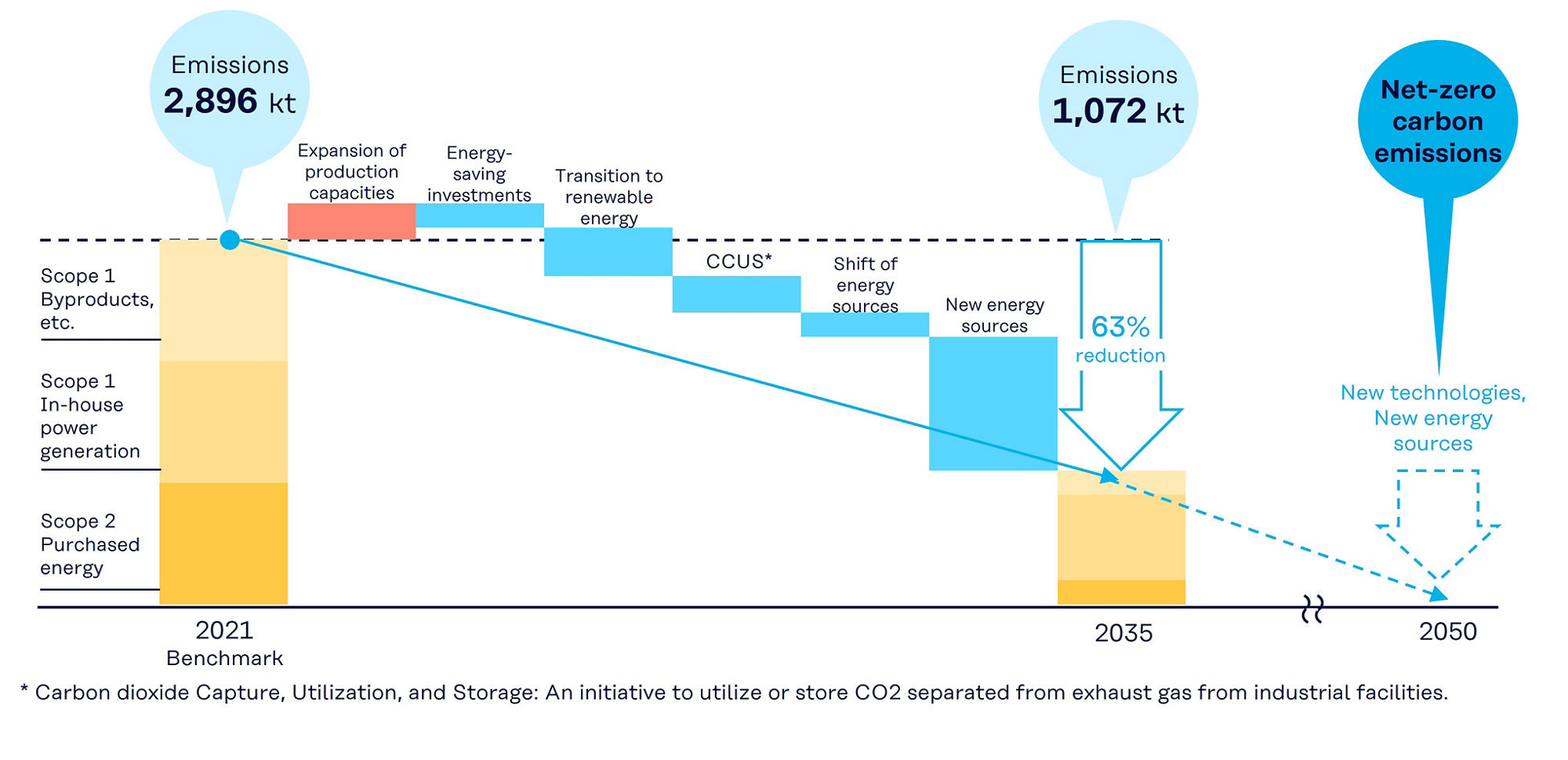 The Kuraray Group has set a new roadmap and goal to reduce Scope 1, 2 emissions by 63% by 2035 compared to 2021 levels. We are steadily implementing reduction measures that can be carried out internally, and we are also working with our utility suppliers to explore the transition of the fuels we use to clean new energy sources. Our aim is to achieve this new goal.