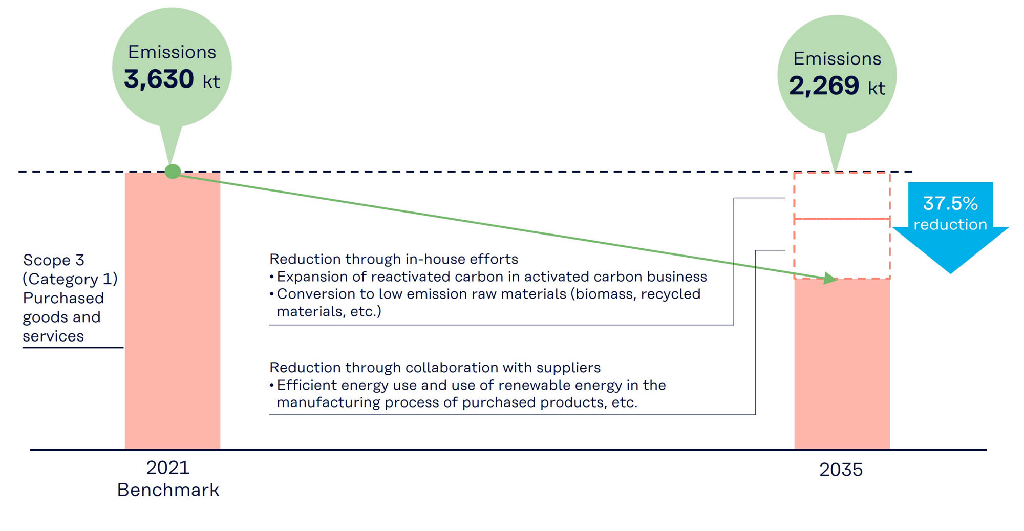 In 2024, we calculated the Scope 3 emissions for the entire Kuraray Group (details are shown in the table below). Through the calculation, we identified that the primary source of emissions is from "Purchased Goods and Services" (Scope 3 Category 1). Consequently, we have set a new goal to reduce Scope 3 (Category 1) emissions by 37.5% by 2035 compared to 2021 levels. To achieve this goal, we are working on transitioning to raw materials with lower GHG emissions, such as biomass and recycled materials, and expanding the use of carbon reactivated in our activated carbon business. Additionally, we aim to achieve our reduction new goal through dialogue and collaboration with our suppliers.