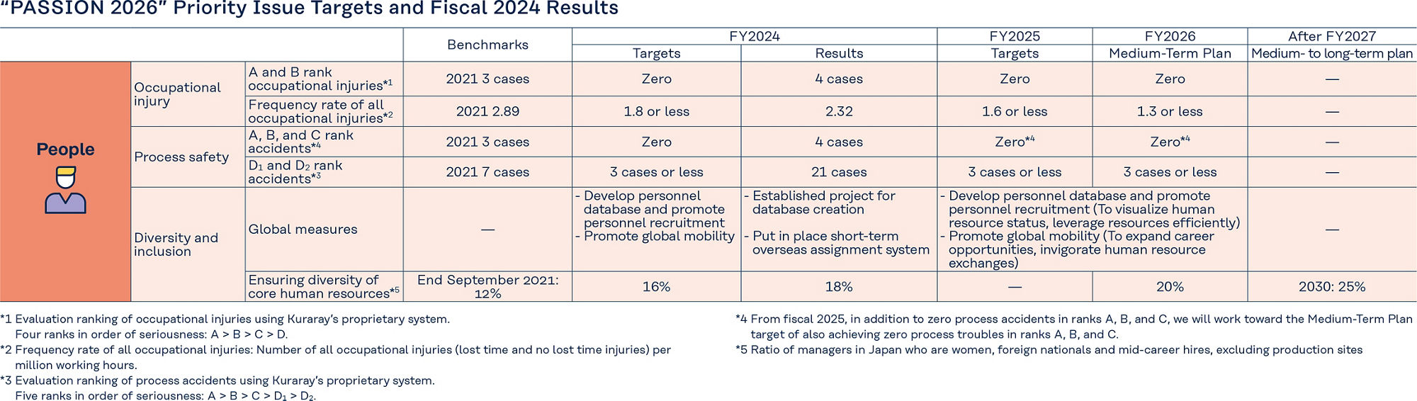 Our Guiding Principle state that “Safety is the cornerstone of everything we do.” Guided by this principle, we have set the following numerical safety targets to ensure that Kuraray is a safe workplace and a company in which everyone can work with confidence for all Group employees.