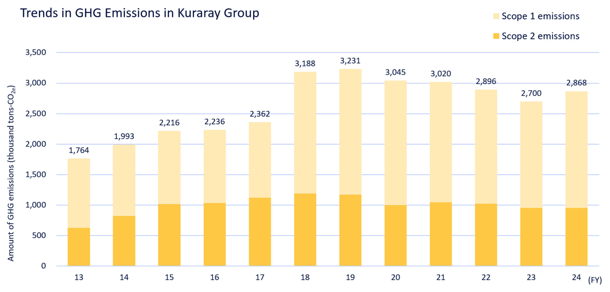 Total GHG emissions (Scope 1, 2) of the Kuraray Group increased by 6.2% from 2,700 thousand tons-CO2e in 2023 to 2,868 thousand tons-CO2e in 2024. (decreased by 5.0% compared to the results in 2021)