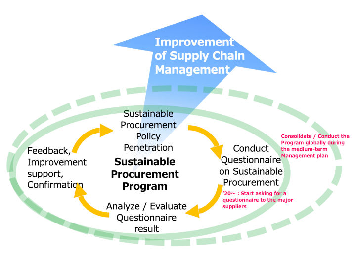 In order to fulfill our responsibility to the entire supply chain from a global perspective, collaboration with our suppliers is critical. We will make it the basis of our purchasing transactions to promote sustainable procurement throughout the entire supply chain by encouraging not only us but also our business partners to make such efforts.