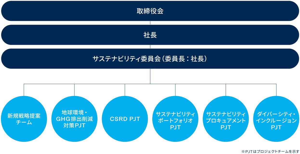 The Sustainability Committee is composed of six project teams (Sustainability Strategy Proposal, Global Climate / GHG Emission Reduction Project, Corporate Sustainability Reporting Directive (CSRD) Project, Sustainability Portfolio Project, Sustainability Procurement Project, and Diversity & Inclusion Project), and Carbon dioxide Capture, Utilization and Storage (CCUS) Project Team as a corporate theme. The Sustainability Committee manages the progress and issues to promote steady implementation. The Sustainability Strategy Proposal Team is composed of cross-organizational and global members who analyze global trends in sustainability and propose necessary strategies for the Kuraray Group. The project teams are not fixed, but it will be flexibly realigned according to the progress of the various measures. In 2024, following the recommendations of the Task Force on Climate-related Financial Disclosures (TCFD), we had disclosed the business impacts of major risks and opportunities based on climate change scenarios. Since the TCFD Project Team has fulfilled its roll, we concluded its activities and formed a new working team, the CSRD Project Team, to respond to the CSRD. This Committee also manages the progress of Plan-Do-Check-Action related to the Responsible Care activities.