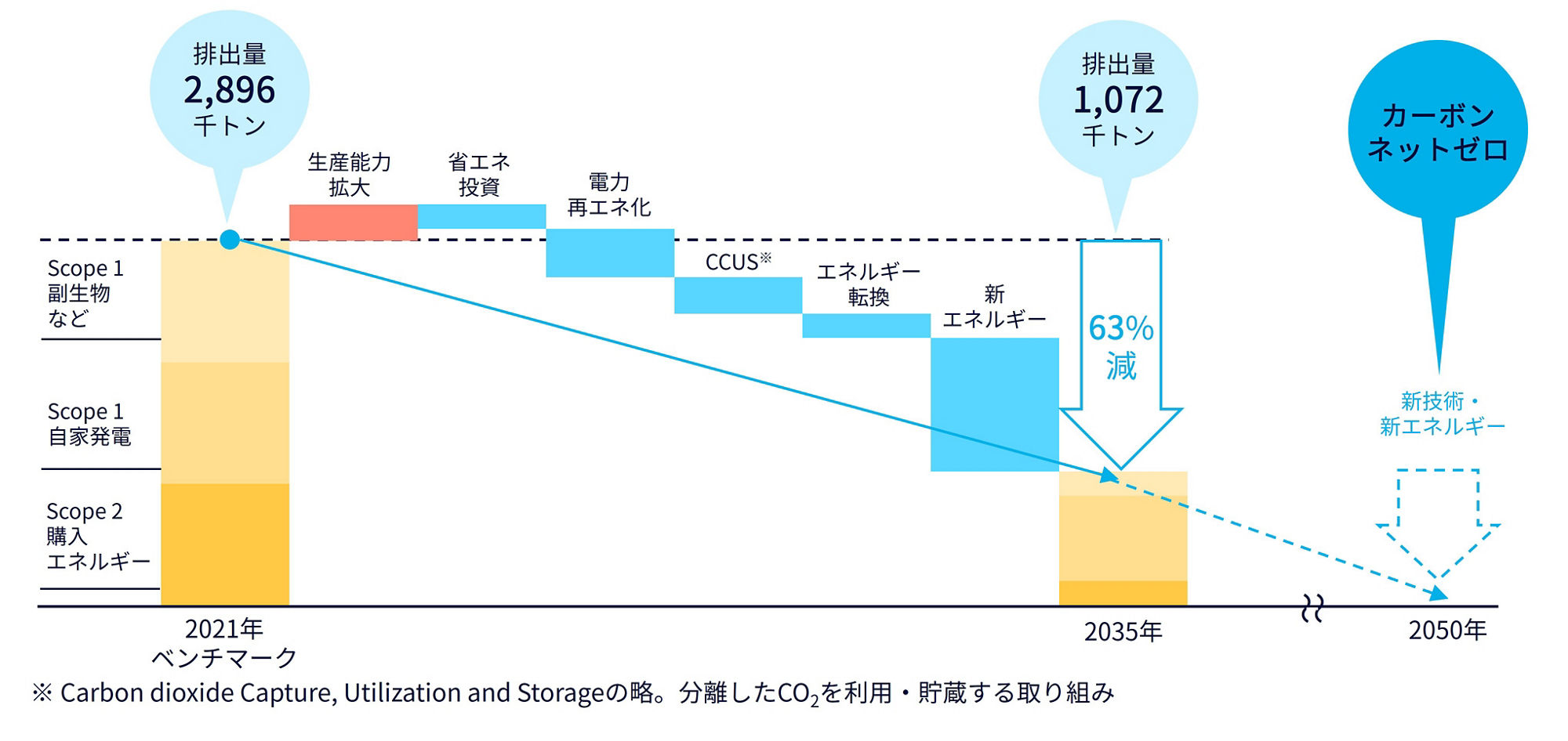 クラレグループは気候変動対策を優先的に取り組むべき重要課題の一つとして捉えており、Scope1、2の排出について2050年カーボンネットゼロの達成を目指しています。クラレグループにおけるScope1、2のGHG排出削減目標およびScope3(カテゴリー1)の排出削減目標は以下のとおりです。