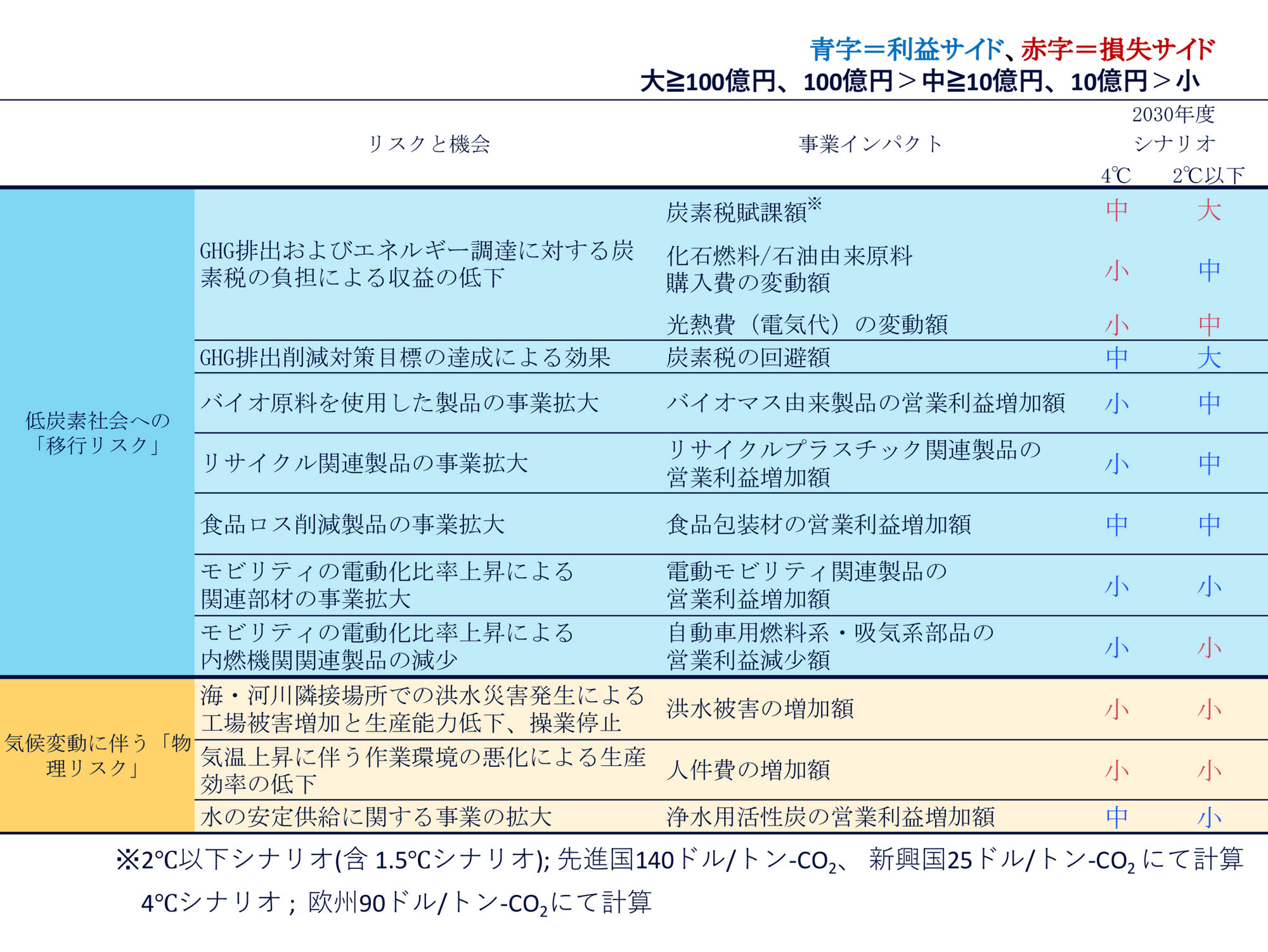 表2 :気候変動シナリオにおけるクラレグループの主要なリスクと機会の事業インパクト
